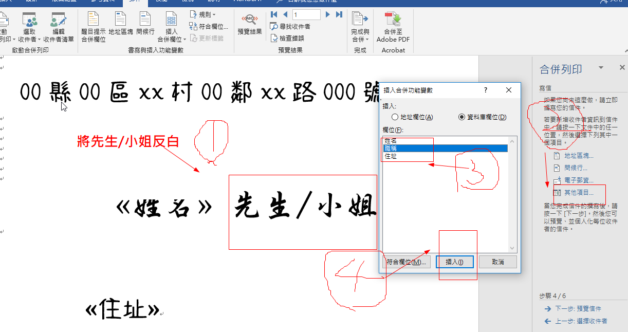 ①將先生/小姐反白②其他項目③按職稱(反白)④插入