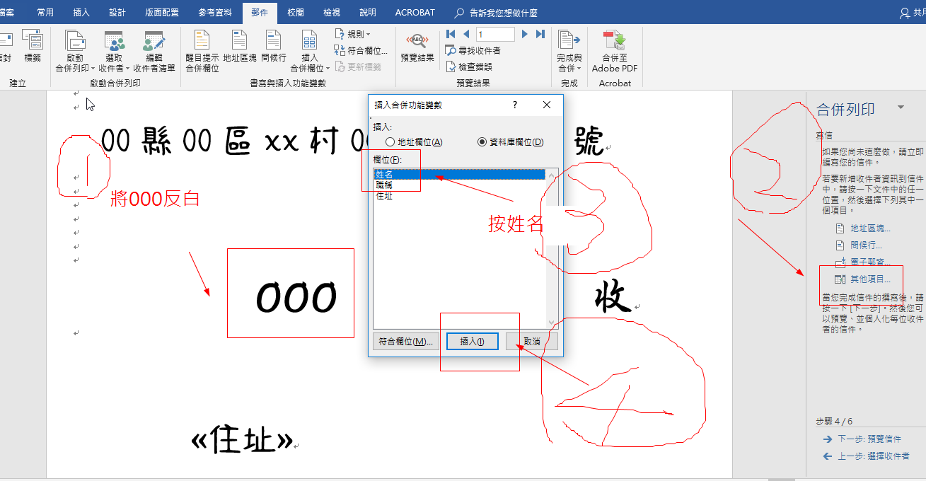 ①將000反白②其他項目③按姓名(反白)④插入