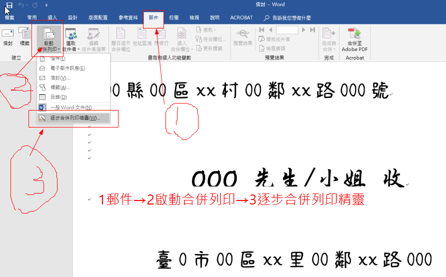 ① 郵件→②啟動合併列印→③逐步合併列印精靈