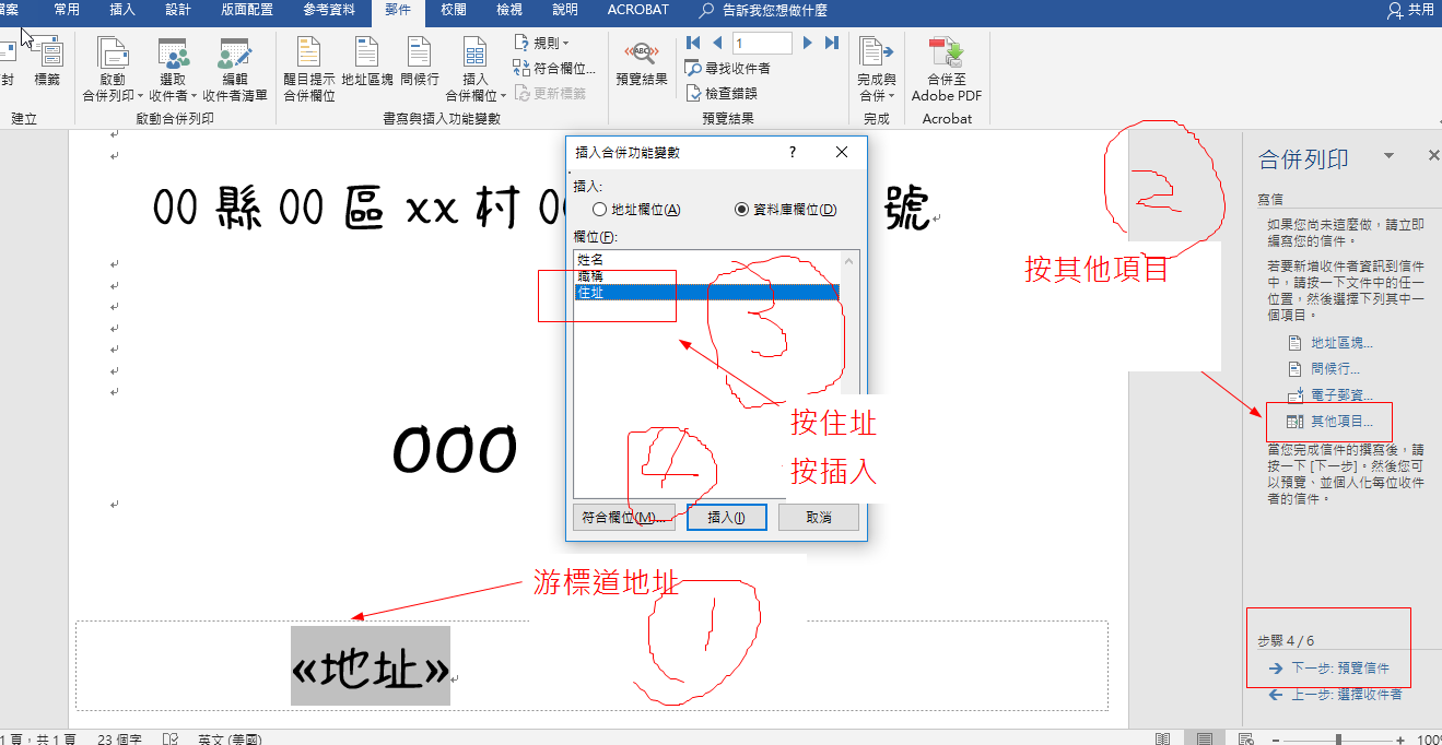 ①游標移到住址②其他項目③點住址(反白)④插入