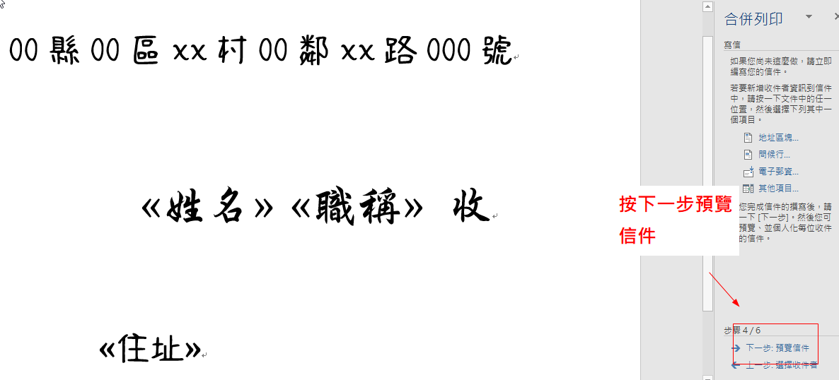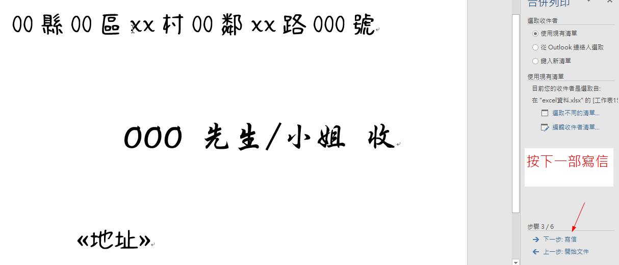 4、右上角選取文件類型圈選信件即可,在右下角步驟1/6按下一步2次,跳過步驟2/6選擇開始文件圈選使用目前文件,來到步驟3/6選取收件者圈選使用目前清單
